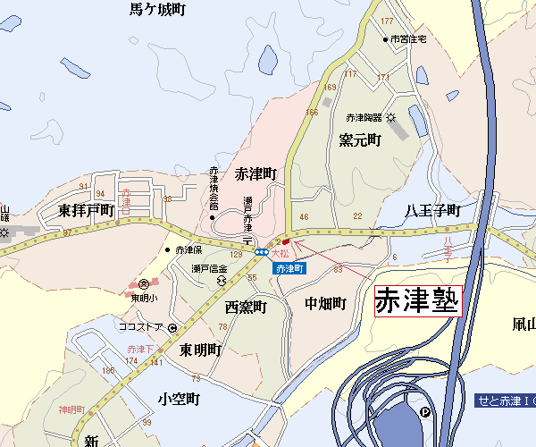 | 赤津塾は名鉄バス「大松」バス停の南東にあります。 赤津町の交差点からは東へ80メートル。 岩屋堂方面から南下してくる道路が、県道33号線と交差する三叉路の正面にあります。 西隣が「中島陶舗」さん、道路を挟んだ北側が「山長陶苑」さん、東隣は空き地です。 |